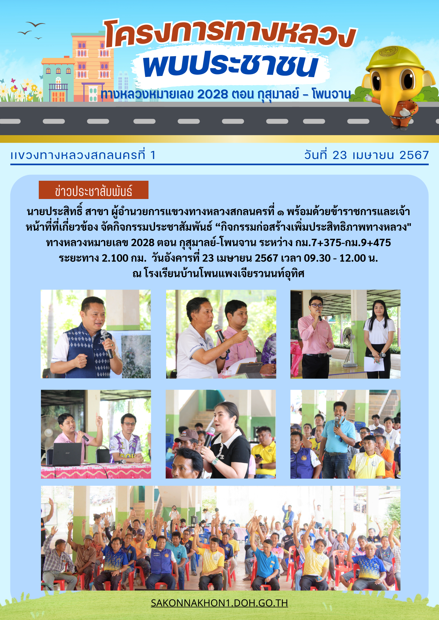 ขอเรียนเชิญประชาชนผู้ใช้ถนนและประชาชนผู้อยู่อาศัยบริเวณ ทางหลวงหมายเลข 213 ตอน สร้างค้อ - สกลนคร เข้าร่วมการประชุม โครงการทางหลวงพบประชน