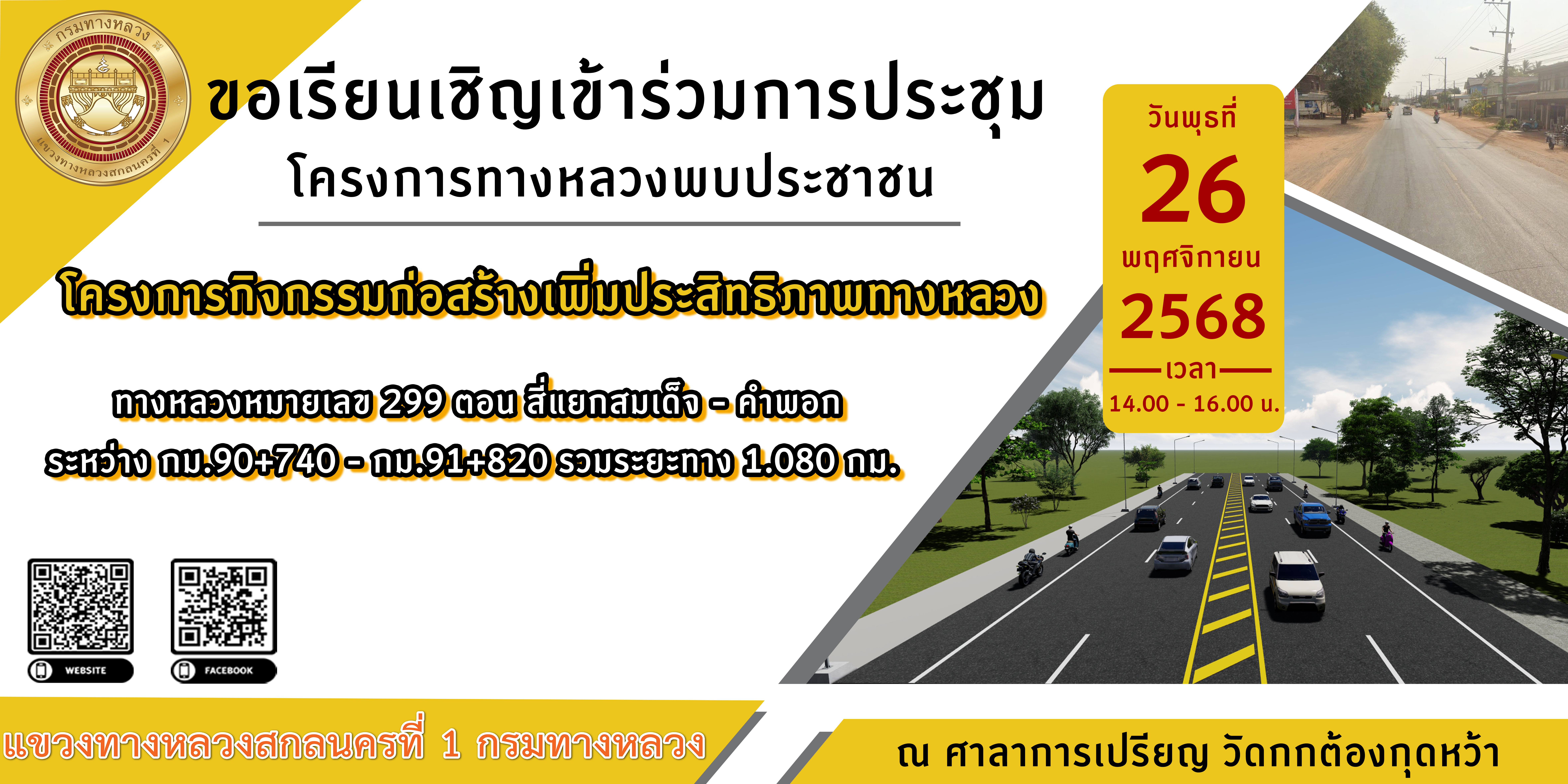ขอเรียนเชิญเข้าร่วมการประชุมโครงการทางหลวงพบประชาชน โครงการกิจกรรมก่อสร้างเพิ่มประสิทธิภาพทางหลวง ทางหลวงหมายเลข 299 ตอน สี่แยกสมเด็จ - คำพอก ระหว่าง กม.90+740 - กม.91+820 รวมระยะทาง 1.080 กม. ณ ศาลาการเปรียญ วัดกกต้องกุดหว้า วันพุธที่ 26 พฤศจิกายน 2568 เวลา 14.00น.