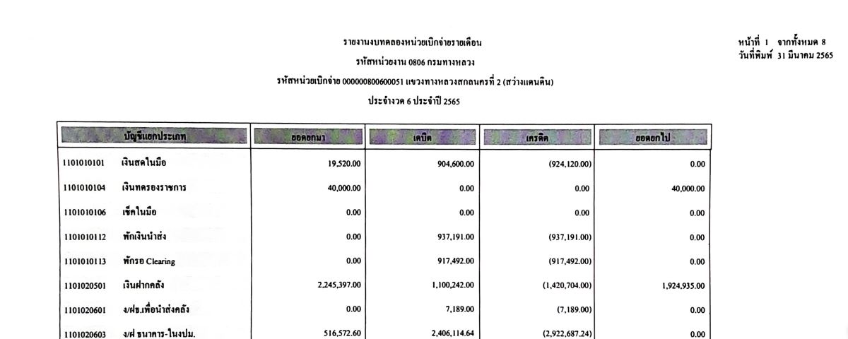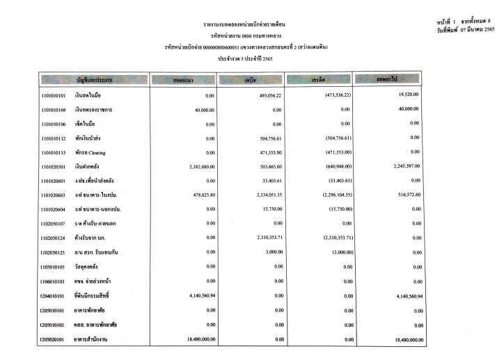 รายงานงบทดลองจากระบบ GFMIS ประจำเดือน มีนาคม 2565